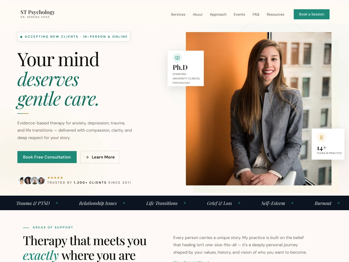 • Professional About Page – Showcase your credentials, experience, and therapeutic approach